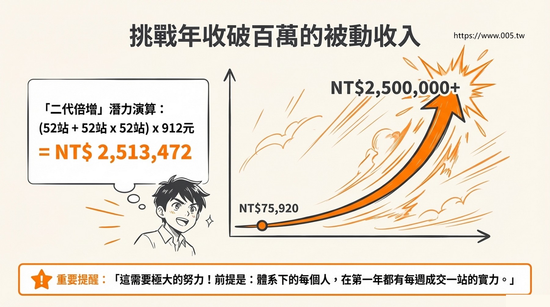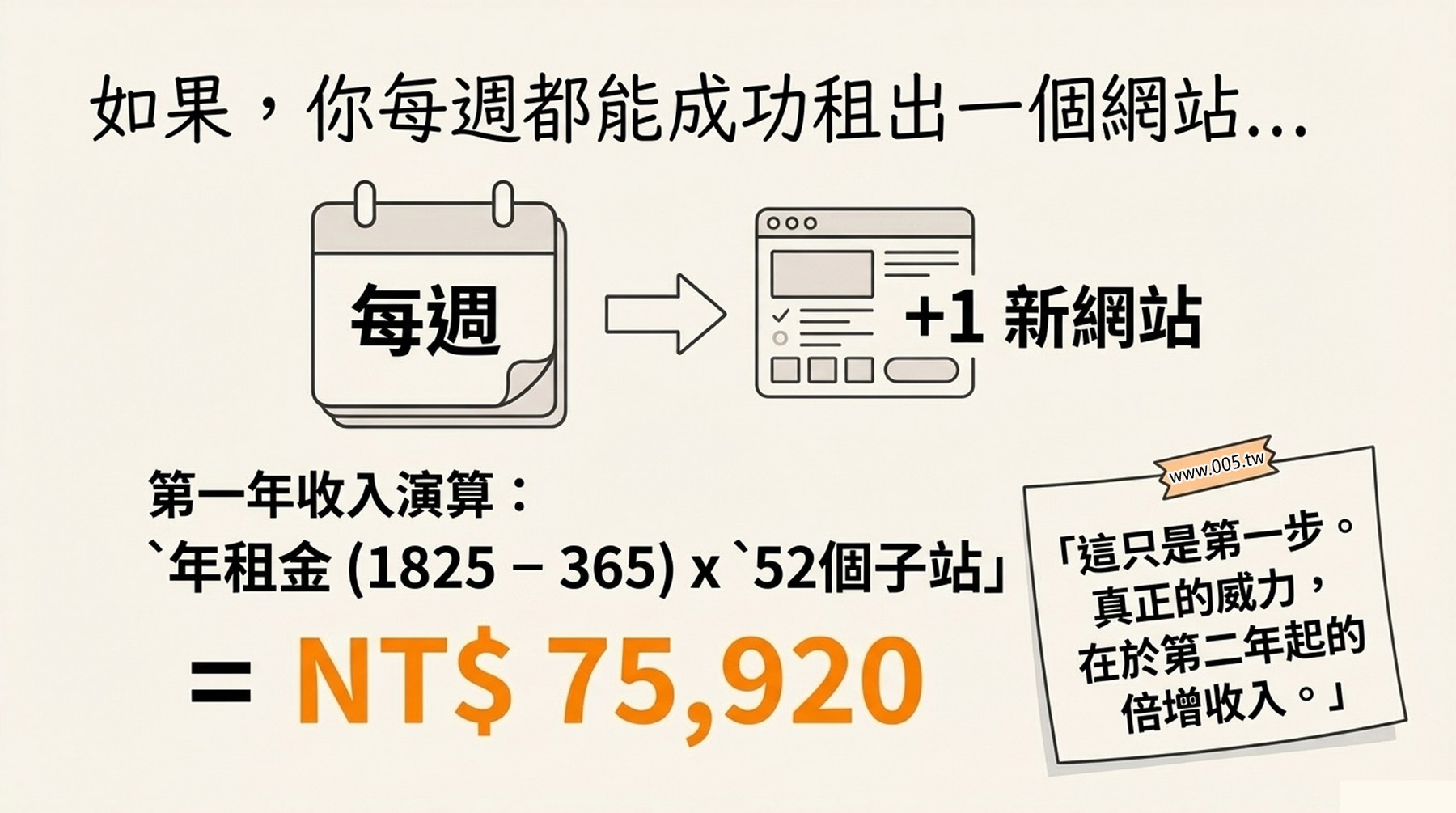 如果你的租客也能夠每週都能夠成功的出租一個網站,那麼第二年以後你的被動收入將會超過 250萬!