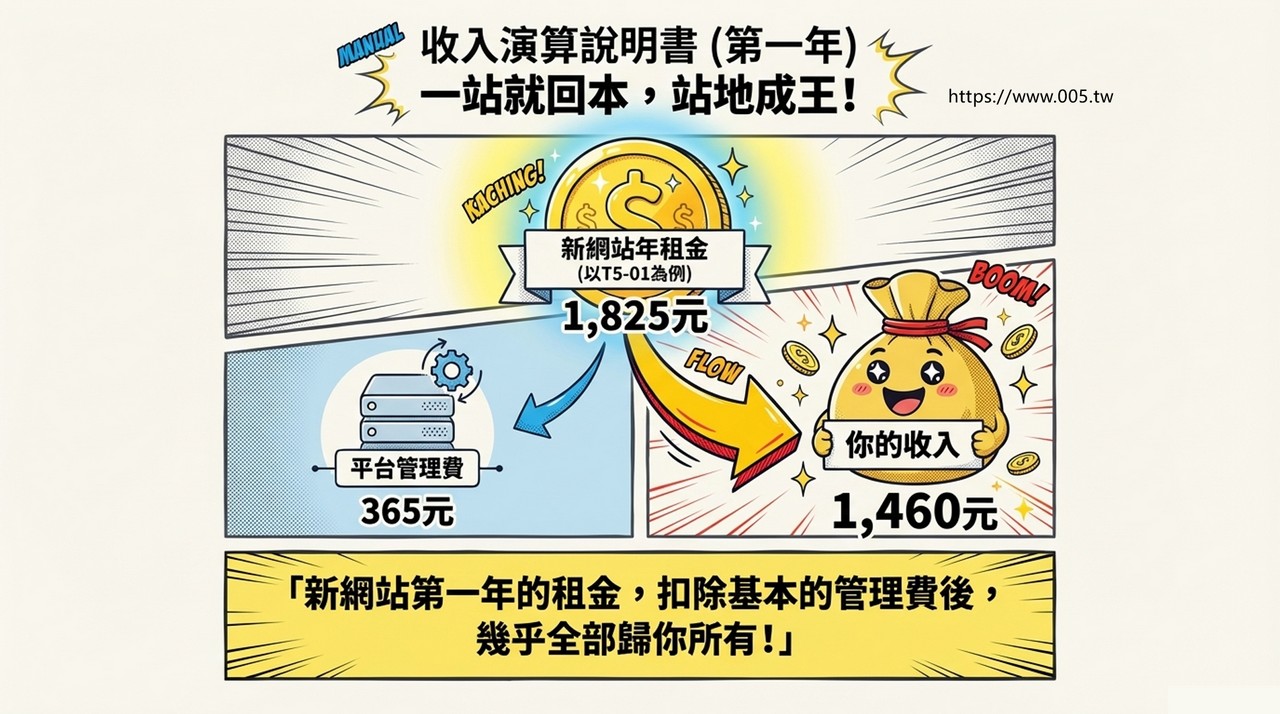 新網站第一年的租金,扣除基本的管理費(365元)後,全部歸你所有!