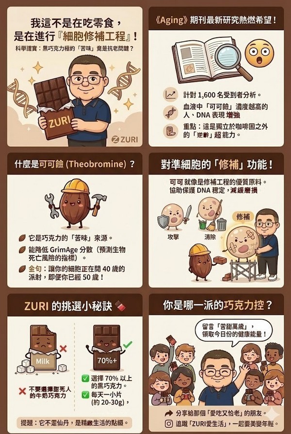 科學家分析了 1,600 名受測者後發現: 血液中**「可可鹼 (Theobromine)」**濃度較高的人,其 DNA 生物標記顯示的生理年齡竟然更年輕!