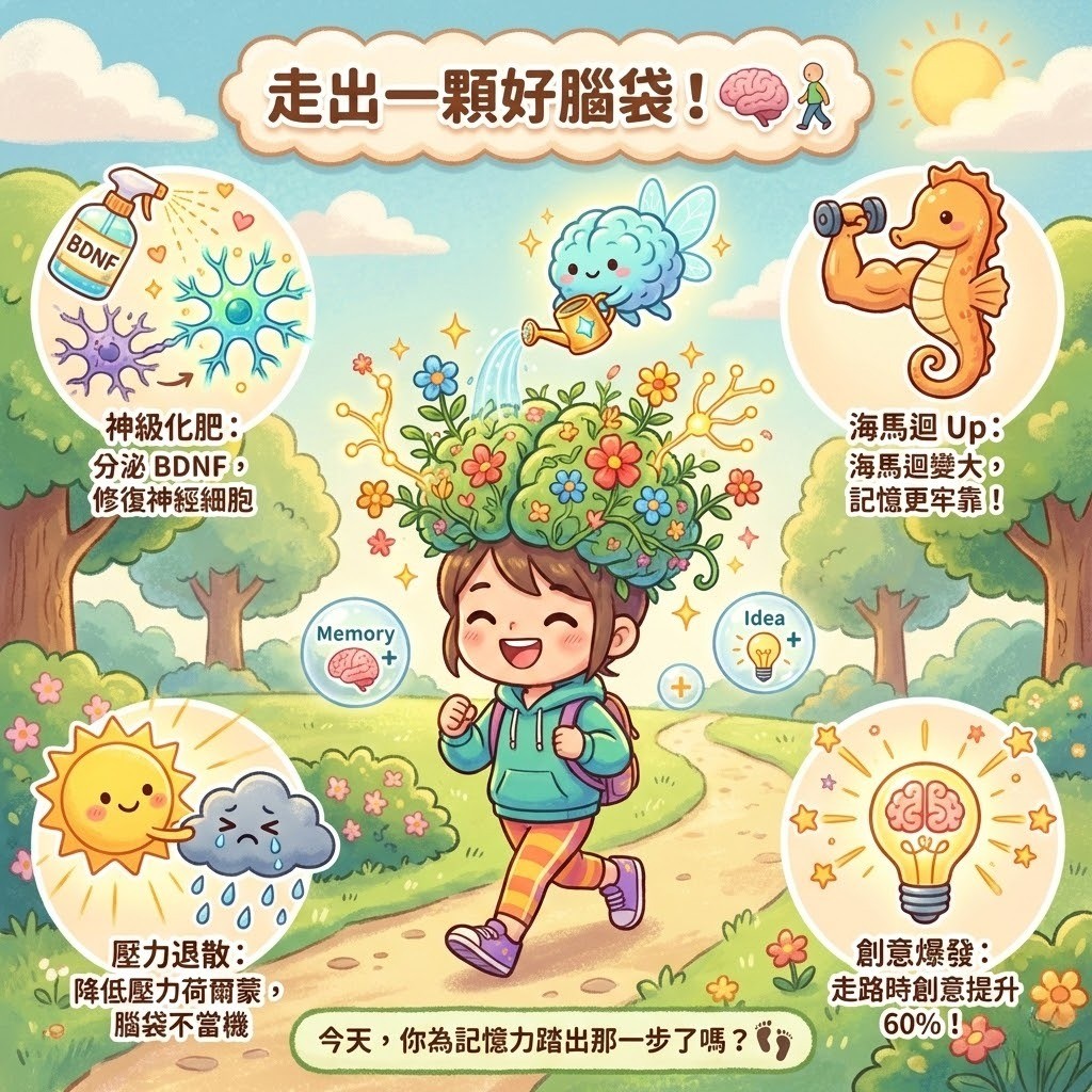 當我們在步行(尤其是快走)時,身體會分泌一種稱為 BDNF(腦源性神經滋養因子) 的蛋白質。哈佛醫學院精神科副教授 John Ratey 曾將其形容為大腦的「神奇化肥」(Miracle-Gro)。BDNF 負責修復受損的神經細胞,並促進新神經元的生長與突觸的連結,這是強化長短期記憶的核心機制。
