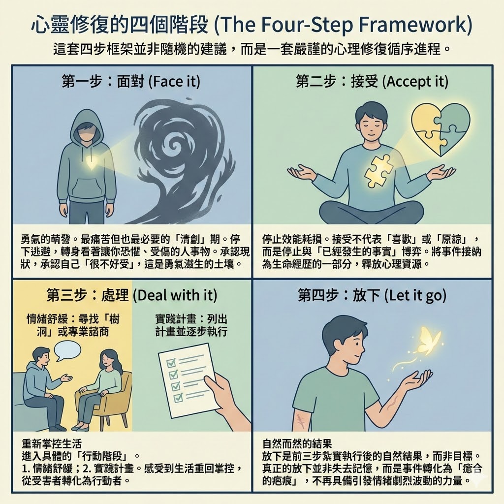 「這兩個字說得輕巧,但對於身處風暴中心的人而言,卻有如千斤重擔。為什麼我們明明知道該往前走,腳步卻依然沉重?為什麼那些道理都懂,卻依然過不好這一關?」