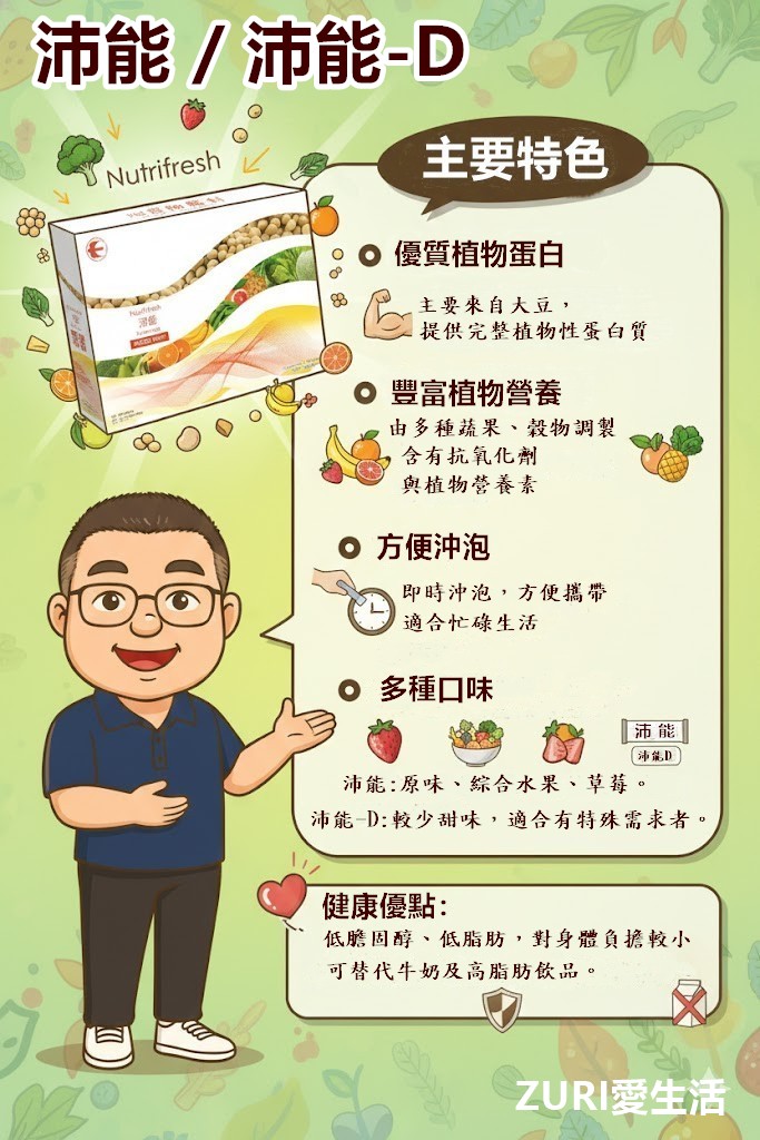 沛能蛋白蔬果飲是根據營養免疫學研發的日常營養補充飲料,沛能由營養豐富的大豆及多種蔬菜、水果等天然植物調製而成的獨特配方,沛能富含大量極易被人體吸收的大豆蛋白質及豐沛的植物營養素和抗氧化劑,是人體補充營養的極佳來源。沛能含有豐富的豆類蛋白質,低膽固醇和低脂肪,是替代高脂肪飲料的理想選擇。