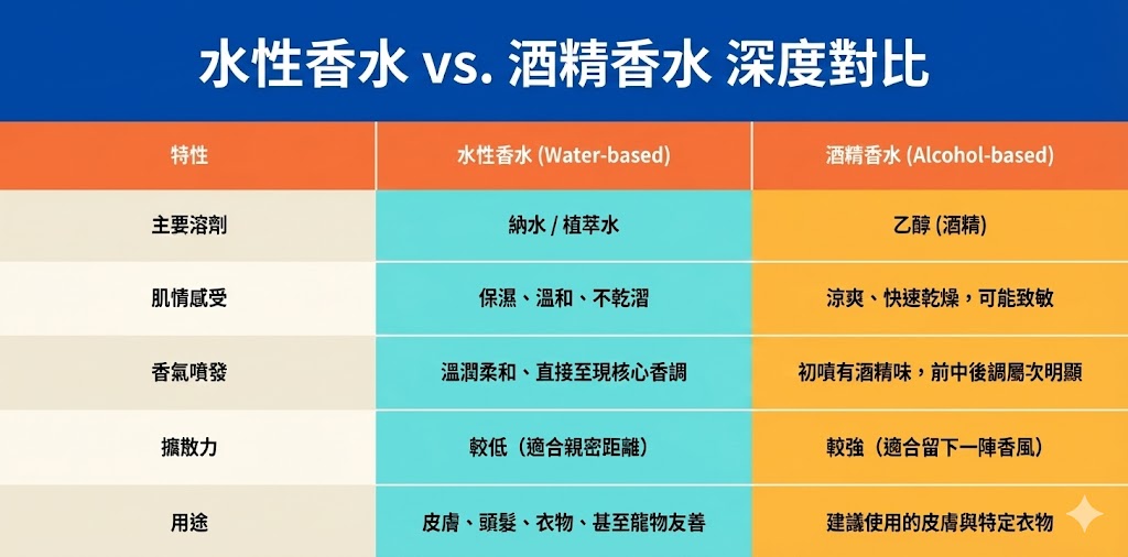 低揮發速度: 雖然水性香水的噴灑範圍(擴散力)可能不如酒精香水,但它的留香時間(在肌膚上的持久度)有時反而會因為水分與肌膚的結合而表現得更穩定。
