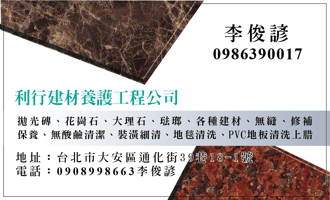 利行建材養護工程公司是一家位於台北市的公司,主要從事石材養護工程,包括大理石無縫處理、石材研磨、拋光、晶化、美容,以及拋光石英磚的膠縫填補。 此外,我們也提供清潔服務,如裝潢細清、地毯清洗、水塔清洗等。